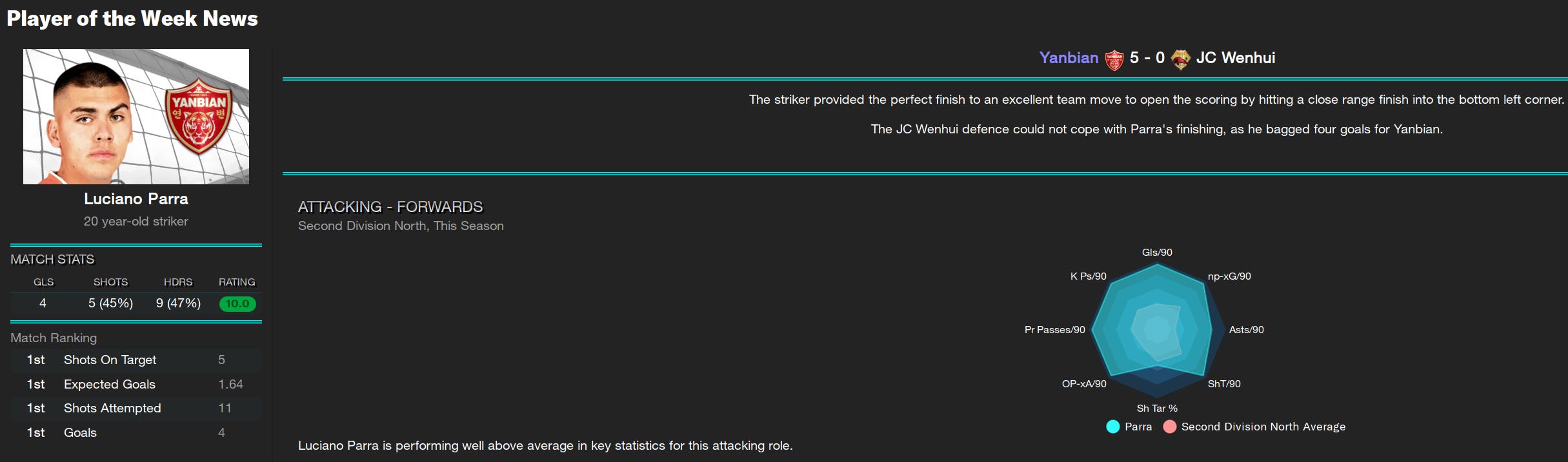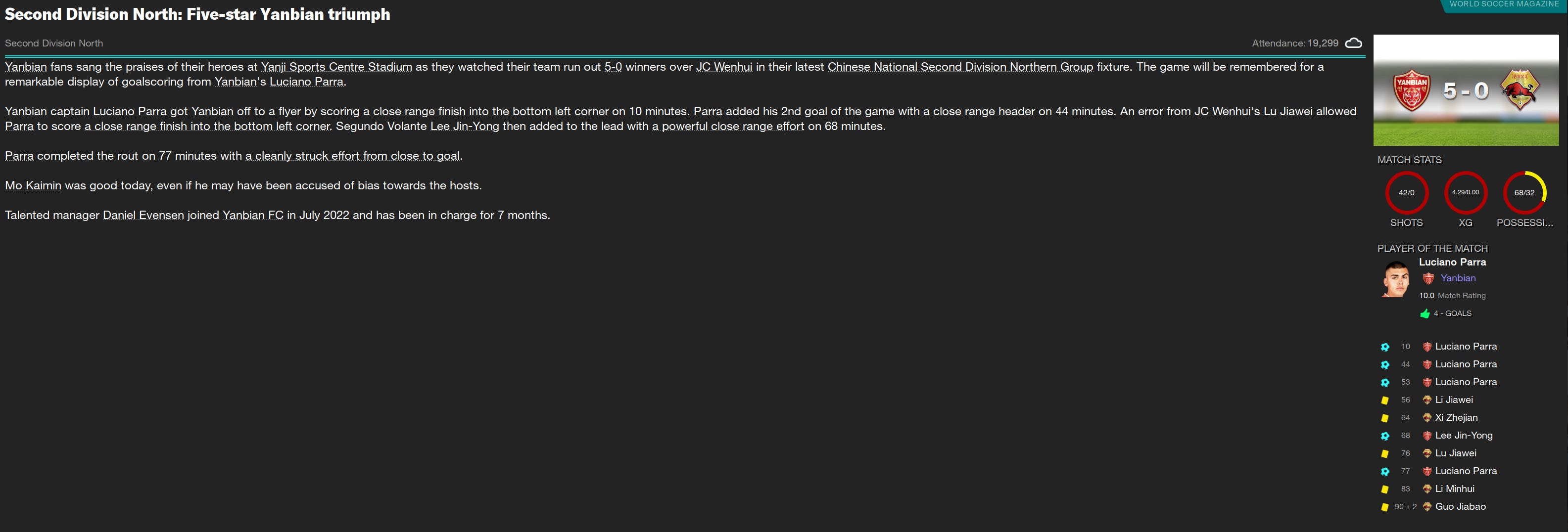 This one was like playing against a team that wasn’t there. Wenhui didn’t get a single shot off, and had an xG of 0. Our 5-0 win was so dominant that it wasn’t fair.