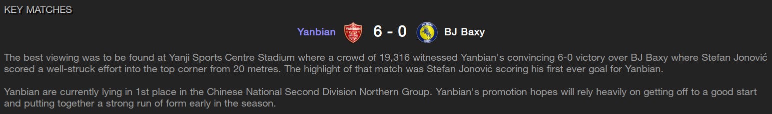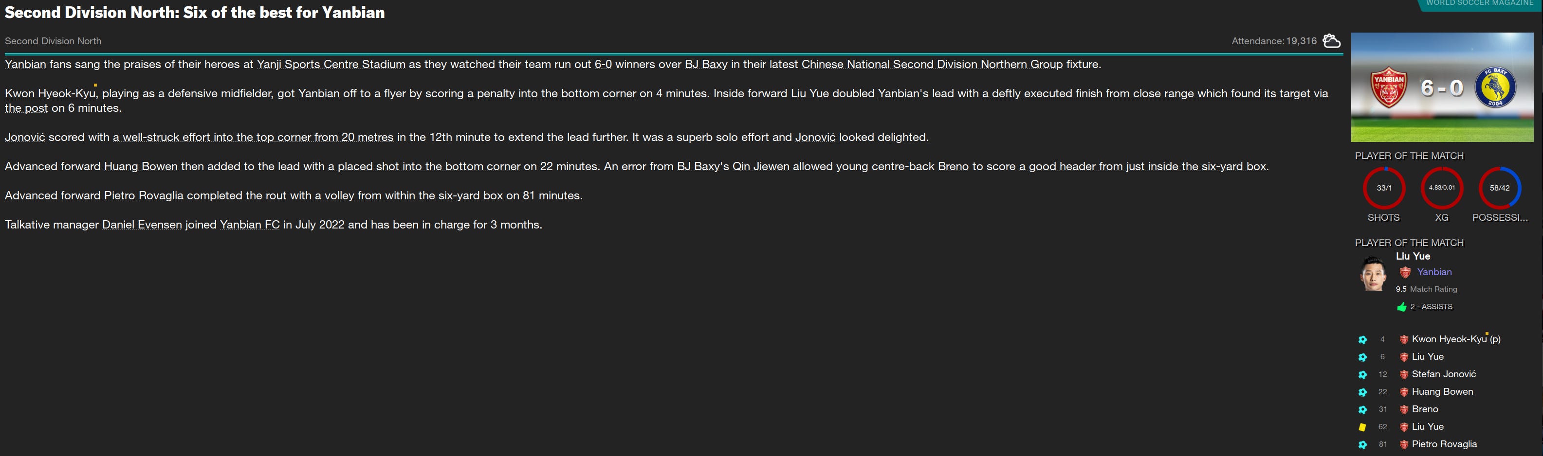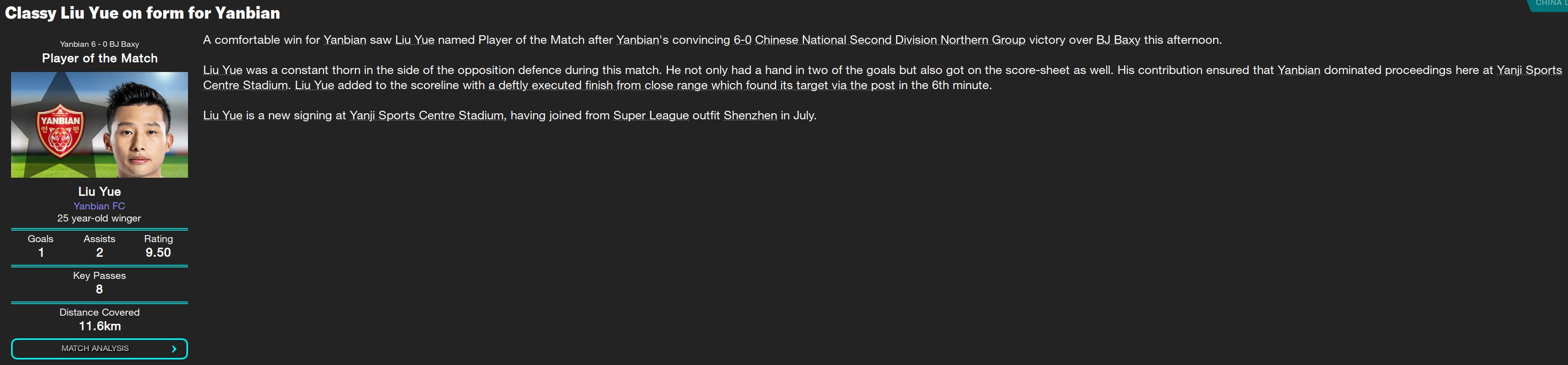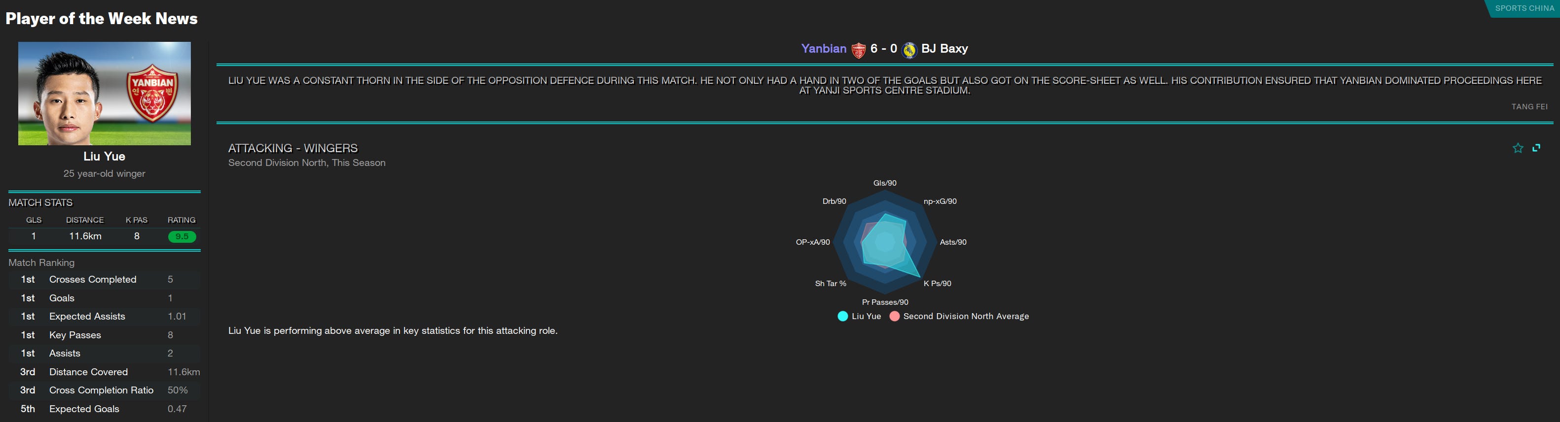 Liu Yue managed to get the man of the match today, though it could have been anybody. He also managed to win the player of the week, though just about anybody on our side could have won that award as well.