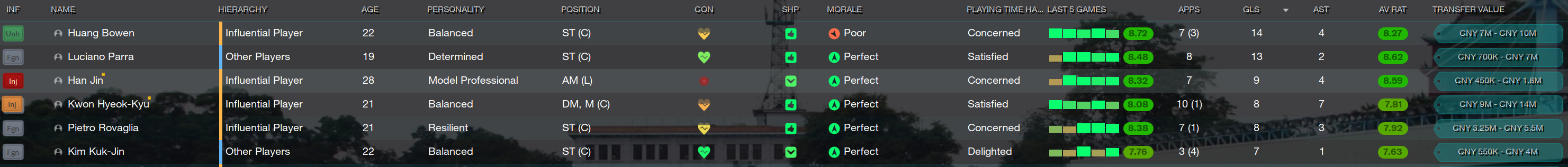 Pietro Rovaglia, who is starting to become upset that I’m not treating him like the star he thinks he is, managed to get another goal in this one. That makes 8 goals in 8 appearances for the 21-year-old, whose only failing is that he’s not as fancy and as consistent as Parra and Huang.
