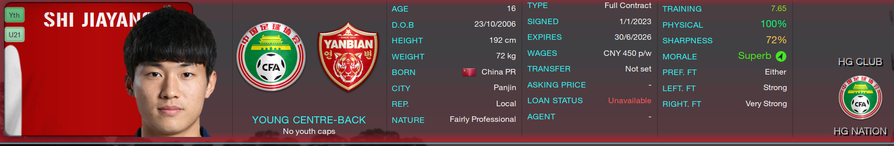 The other experiment will be Shi Jiayang, a 16-year-old centerback who is clearly not good enough at the moment.