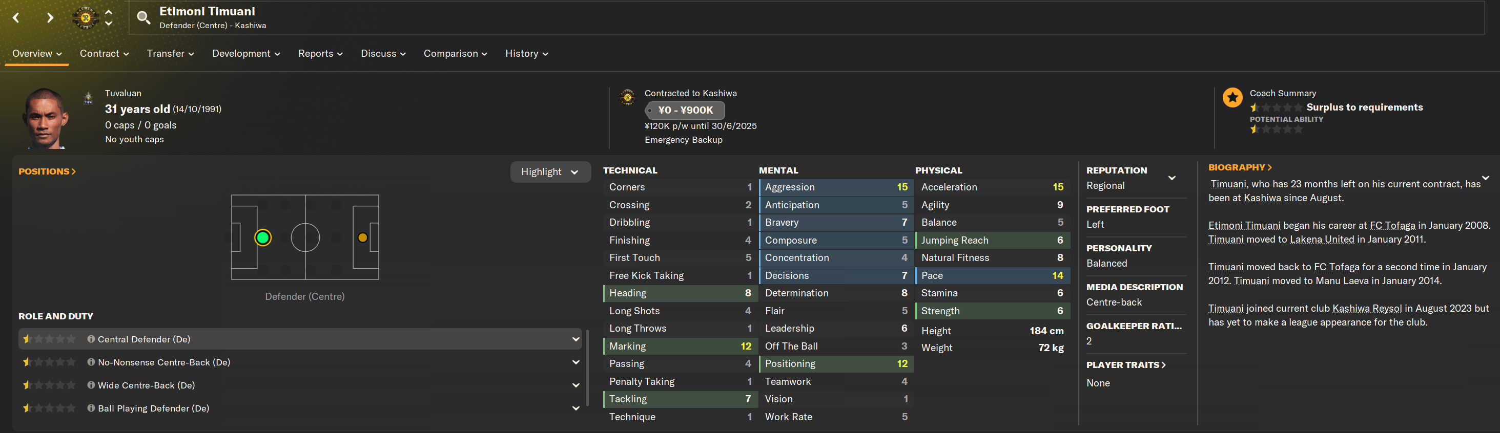 Aside from the 15 rating for acceleration and the 14 for pace he has at the start of the game, there’s really nothing to get excited about here. This is a poor player who doesn’t really belong on any squad outside Tuvalu.