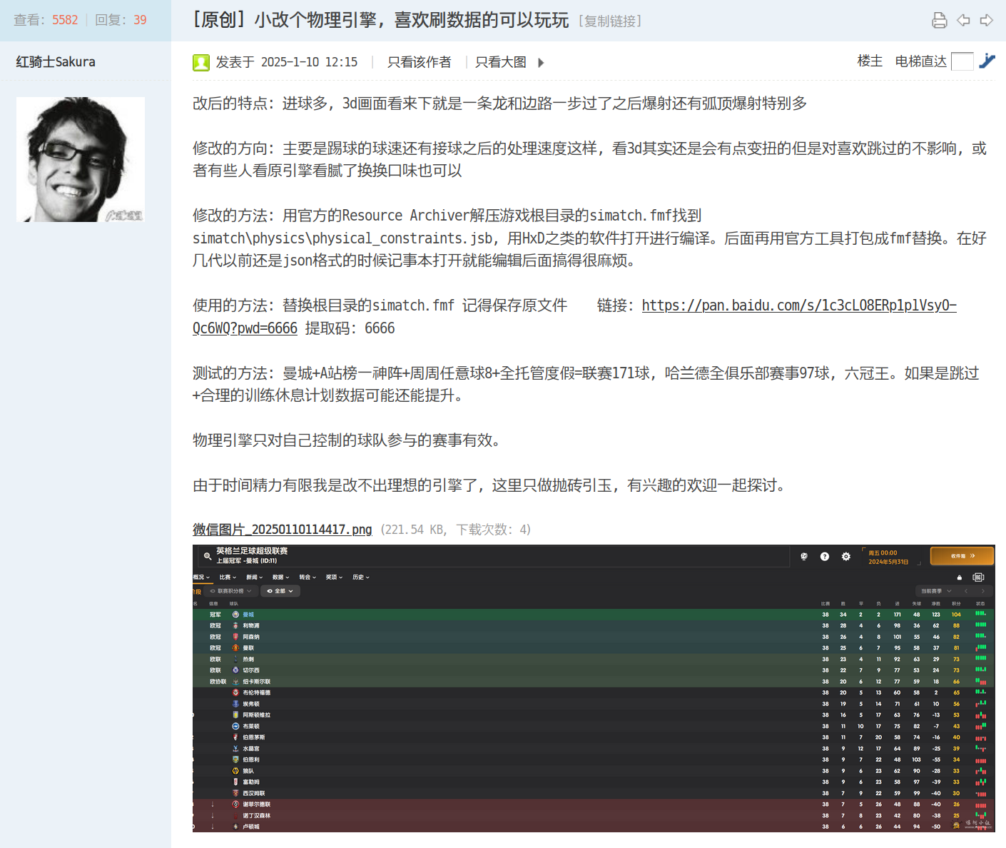 Basically, what 红骑士Sakura did was edit the “physical_constraints.jsb” file contained in the default simatch.fmf file. This is apparently the file that includes the calculations Football Manager uses for the physics engine. He edited this file using HxD, which is a freeware hex editor program.