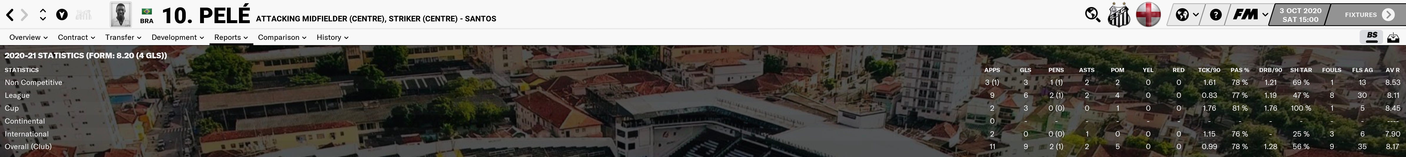 As you’d expect, Pelé’s form has been absolutely superb so far. 6 goals in 9 appearances in the league isn’t necessarily amazing, but he’s been playing well in every single game, maintaining an average rating above 8 – absolutely amazing for Football Manager.