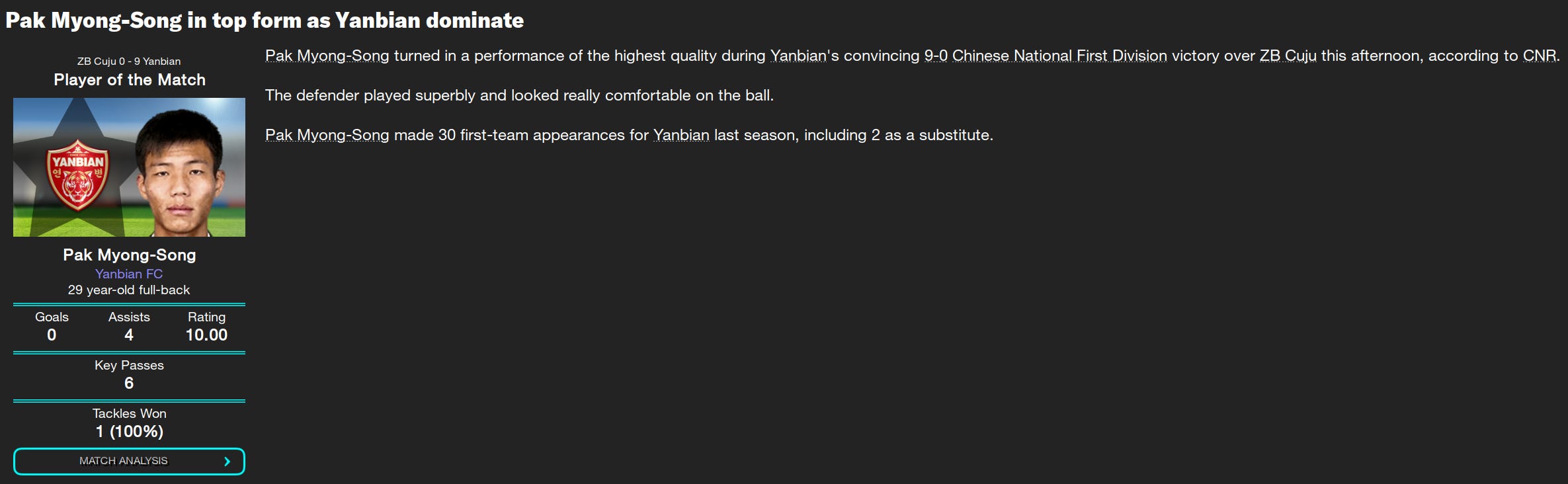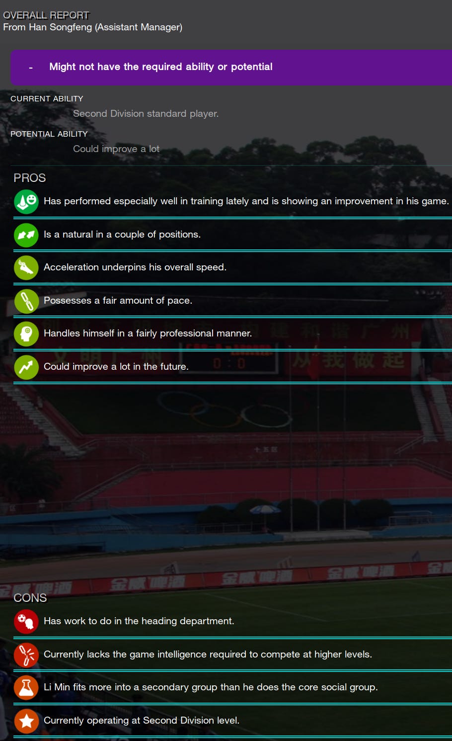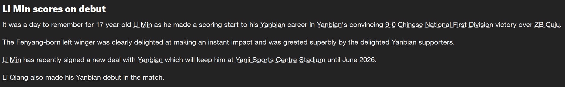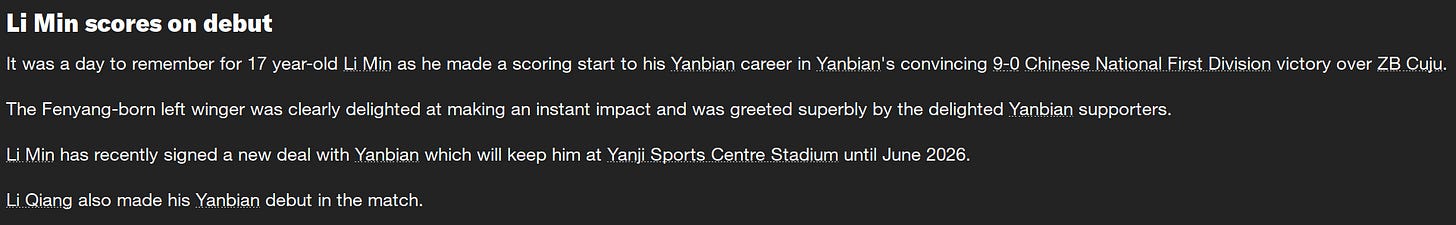 His name is Li Min. He’s 17 years old and plays attacking right wing. He’s one of the young Chinese players that I want to give more playing time to, chiefly to ensure that we’re not bitten too badly by the various UEFA squad registration requirements as the years go by.