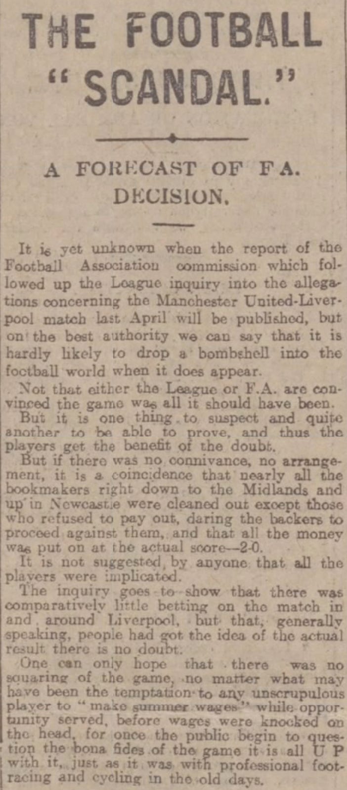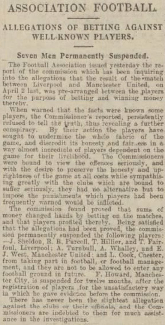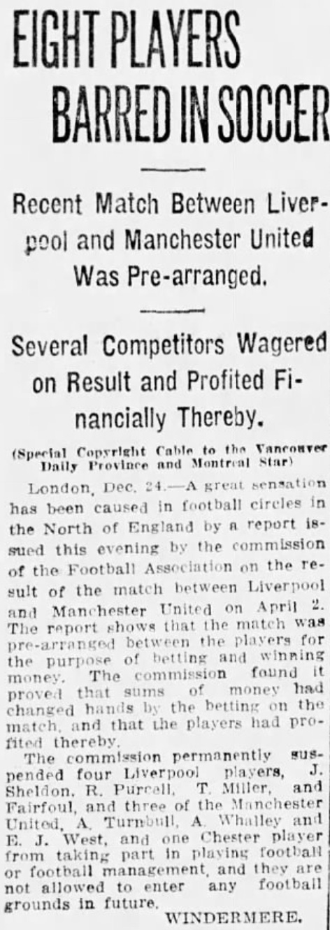 Now, Wikipedia reports that the Football Association’s decision came down on December 27, 1915. This resulted in 7 players being suspended for life. However, the newspapers indicate that the decision may have come a bit earlier: