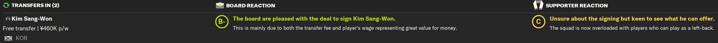 Kim Sang-won came into our club as the third string right wingback. I bought him on a free transfer because we desperately needed depth at the position.