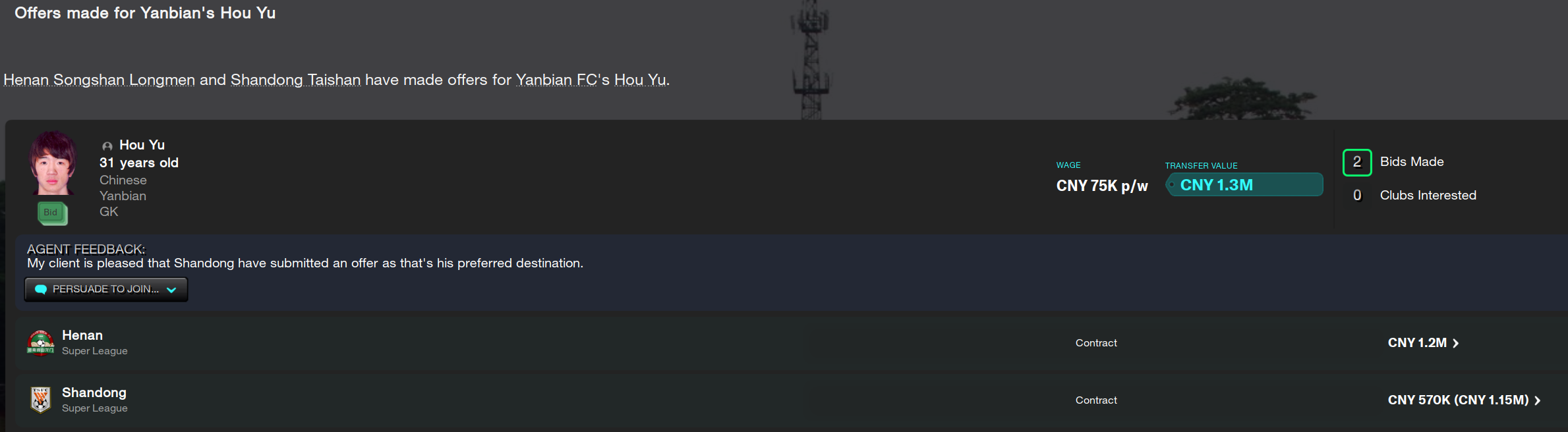 Shandong Taishan in the China Super League made a 1.15 million RMB offer for him. That sounded about right to me. I accepted it, knowing full well that we have a whole host of goalkeepers superior to Hou Yu coming soon.